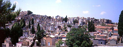 山の上のバスターミナルからはこんな景色が目に入った。 人が住むに家にしては小さい。 人家をそのまま相似形を保ったまま小さくしたような感じだ。 見るものの遠近感を狂わせるような、不思議な光景だ。 お墓かもしれない・・・?