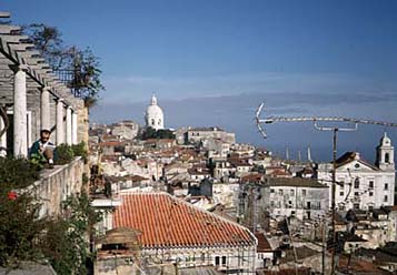 宿探しも忘れて,訳もなくうろついていると突然景色が開けました。アルファマの入り組んだ家並みのむこうにテージョ川が見えます。青い空がすがすがしい。