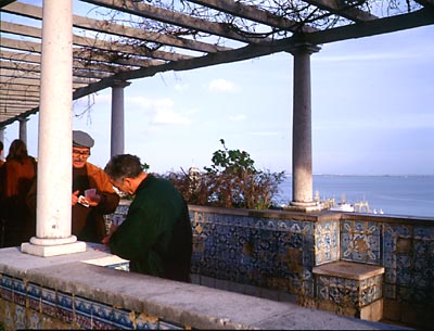 サンタルジア展望台 この広場にあった大きなタイル絵ははがされて 古い建物の壁がむき出しになっていた。(博覧会展示のため?) テージョ川を背景におじさんたちがカードゲームに興じていた。