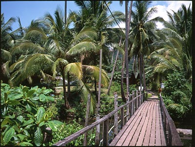 おじさんが案内してくれたところ、そこは海のそばではなく山の中に少し入っ たところ。 ジャングルの中にバンガローが点在しているという感じで雰囲気は 最高です。 部屋も小ぎれいで蚊帳もついているし・・・ でも、「海辺の部屋にとまりたい」という妻のたつての希望があったので 別のところを探すことにしました。 おじさんには、 もしどこも空いてなかった らまたくるよ・・・ と言って。