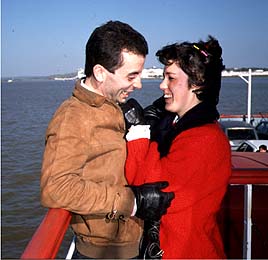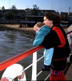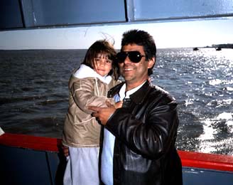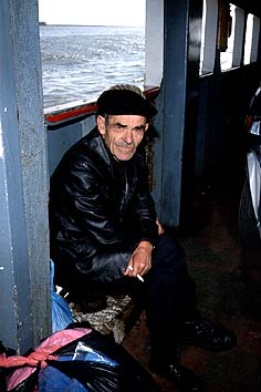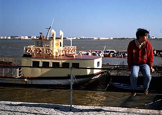 私たちはレンタカーと一緒に船でこの川を渡ります。船には,買い出しを終えて帰るジプシーのような人たちがいっぱい荷物を持っての乗り込んできます。その他にも,若いカップル,親子,赤ちゃん,手ぶらのおじさん,いろんな人が乗ってきます。それと車・バイク・自転車・荷車いろんなものをごちゃ混ぜにして運んでいきます。