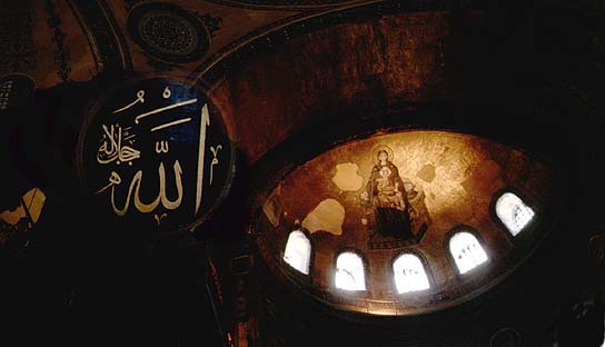 ここは、イスタンブールにあるアヤソフィア大聖堂です。元々ギリシャ正教の教会だったのですが、いわゆるコンスタンティノープルの陥落でオスマントルコに征服された後、時の王メフメット2世が壁を漆喰で塗りつぶすなどして、モスクに変えてしまいました。