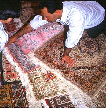 次の瞬間に現実のものとなりました。執拗な押し売りの始まりです。今度は1枚1枚たたみながら、一つ一つの絨毯の説明に加えて、なぜこんなに素晴らしい絨毯を買っていかないのか、日本じゃこんなに安く買えないだろう、買えば一生物だ、金銀より価値がある、政府公認証付きだ、 カ−ドも使える、空輸もする、等々。ムラノオジョウサンと私たちの収入の比べものにならないほどの違いまで引き合いに出されます。こちらは日本の住宅事情をこと細かに説明するなどして対抗。