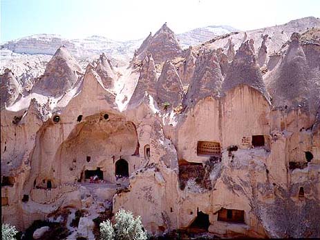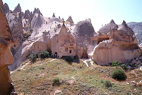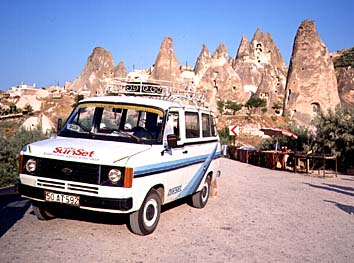 さあ、カッパドキアツアーの始まりです。リーダーは気さくで少しだけ渋めの映画俳優ふう。メンバーはフランスの女の子2人・同3人家族・香港の女の子3人と我々と言う多国籍グル−プ。フランスの女の子2人が英語が全然わからないので、仏語でも説明する事になりました(ズルイな)。ツアーリーダーは2回説明で大変そう。