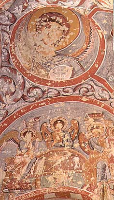 これはギョレメと言う村にある岩窟教会のフレスコ画です。イスラム教徒の侵略を受けた後も熱心なキリスト教徒はこのような岩穴や地下都市に移り住んで密かに信仰を守り続けたそうです。絵は単純で稚拙ですがそれゆえかえってリアリティがある。やむなく隠れて信仰を続けた信者の苦悩がうかがえます。